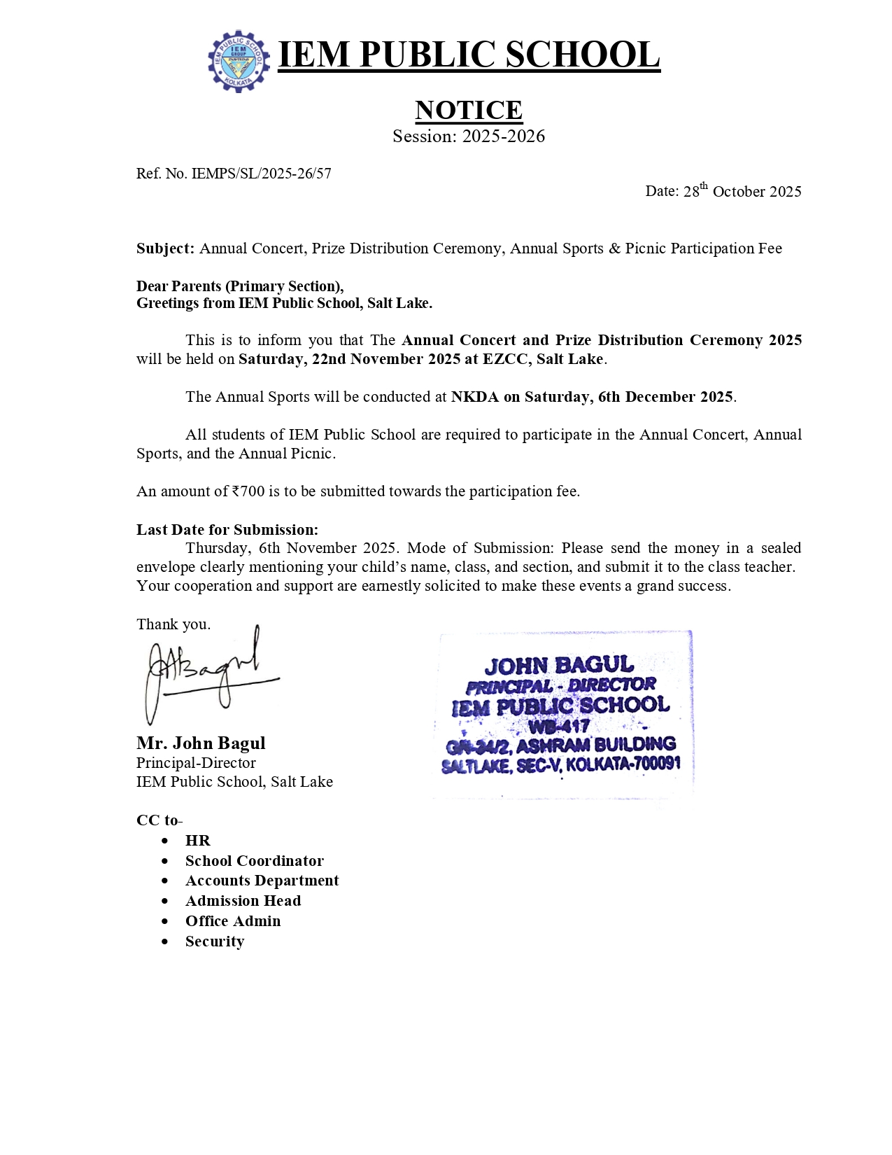 Notice No. 57 – Annual Concert, Prize Distribution Ceremony, Annual Sports & Picnic Participation Fee (GE)