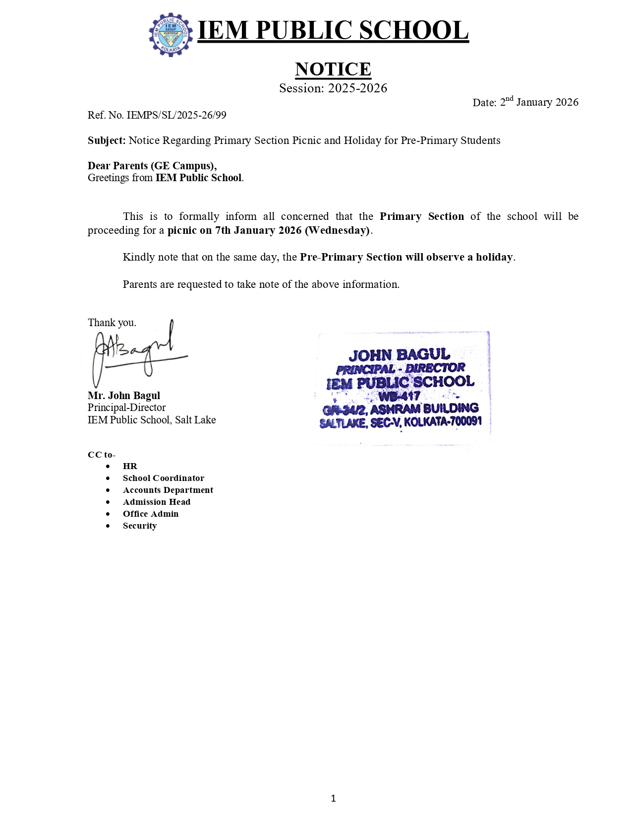 NOTICE REGARDING PICNIC OF PRIMARY STUDENTS